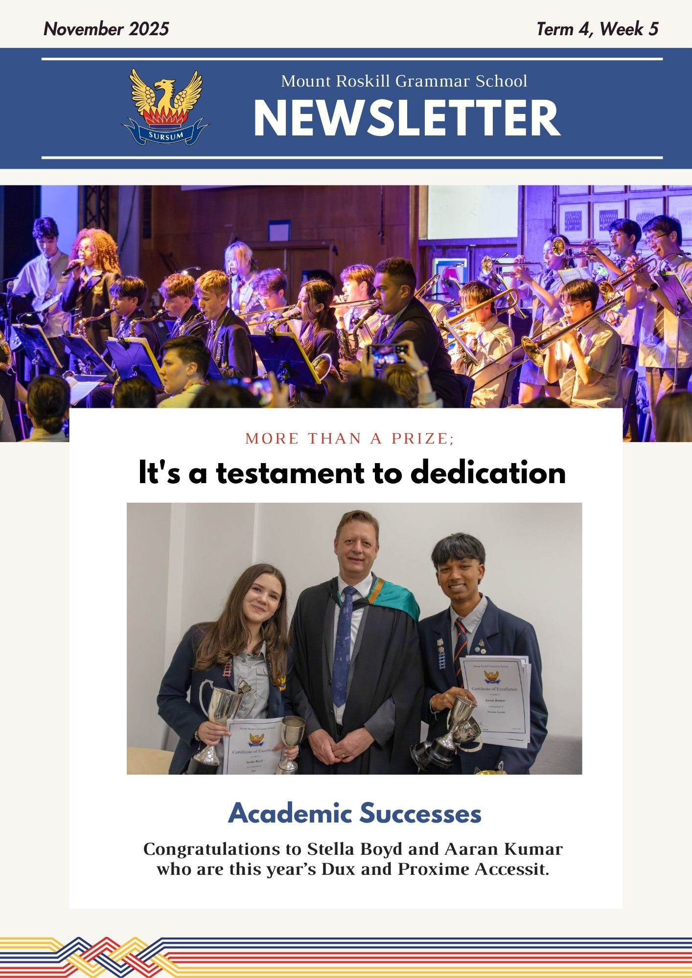 Academic Successes – Congratulations to Stella Boyd and Aaran Kumar, who are this year’s Dux and Proxime Accessit.
